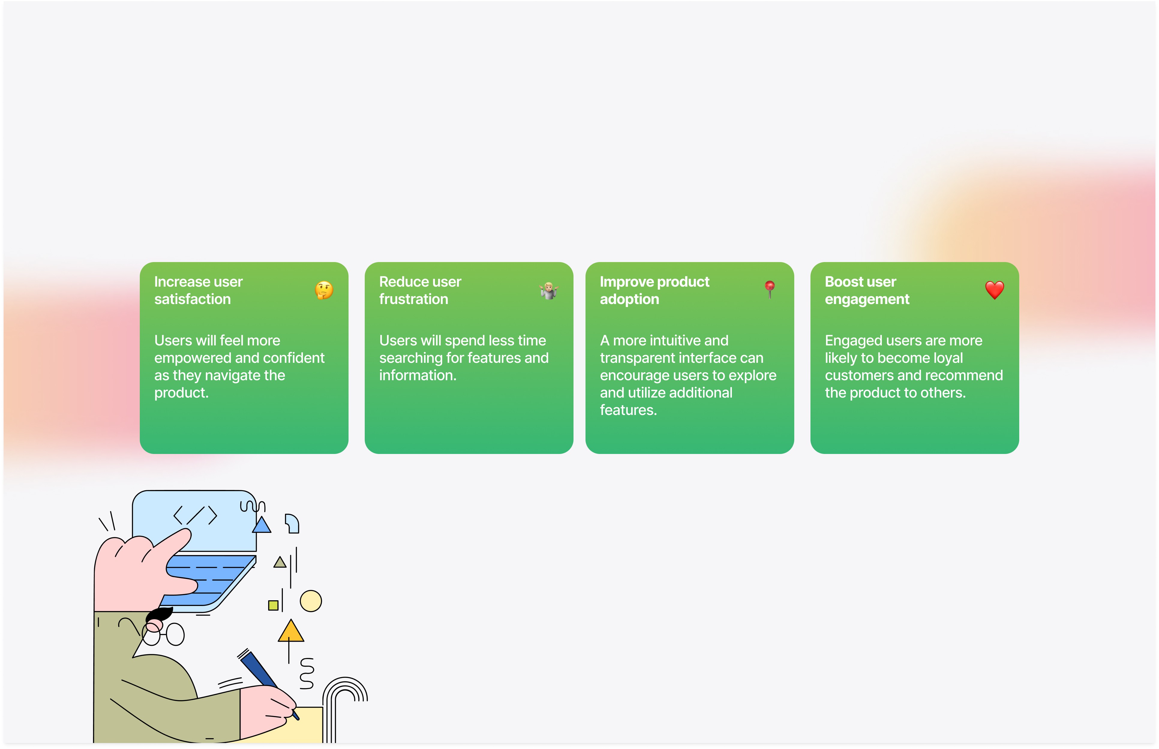 Increasing user satisfaction can empower users, making them feel more confident as they navigate the product. By reducing user frustration, users will spend less time searching for features and information, leading to a smoother experience. An intuitive and transparent interface can also improve product adoption, encouraging users to explore and make use of additional features. As a result, boosting user engagement is likely, which increases the chances of users becoming loyal customers and recommending the product to others.